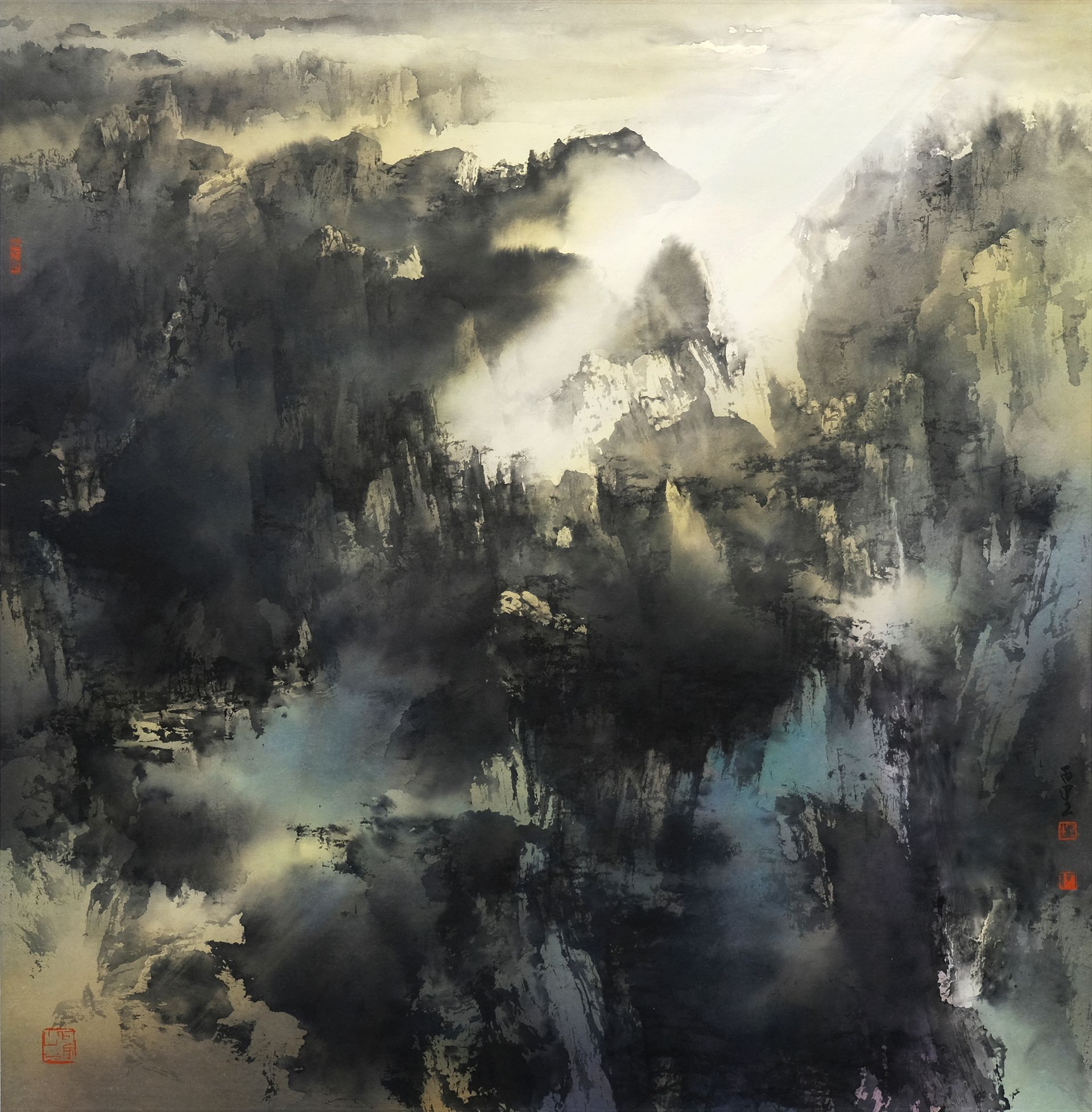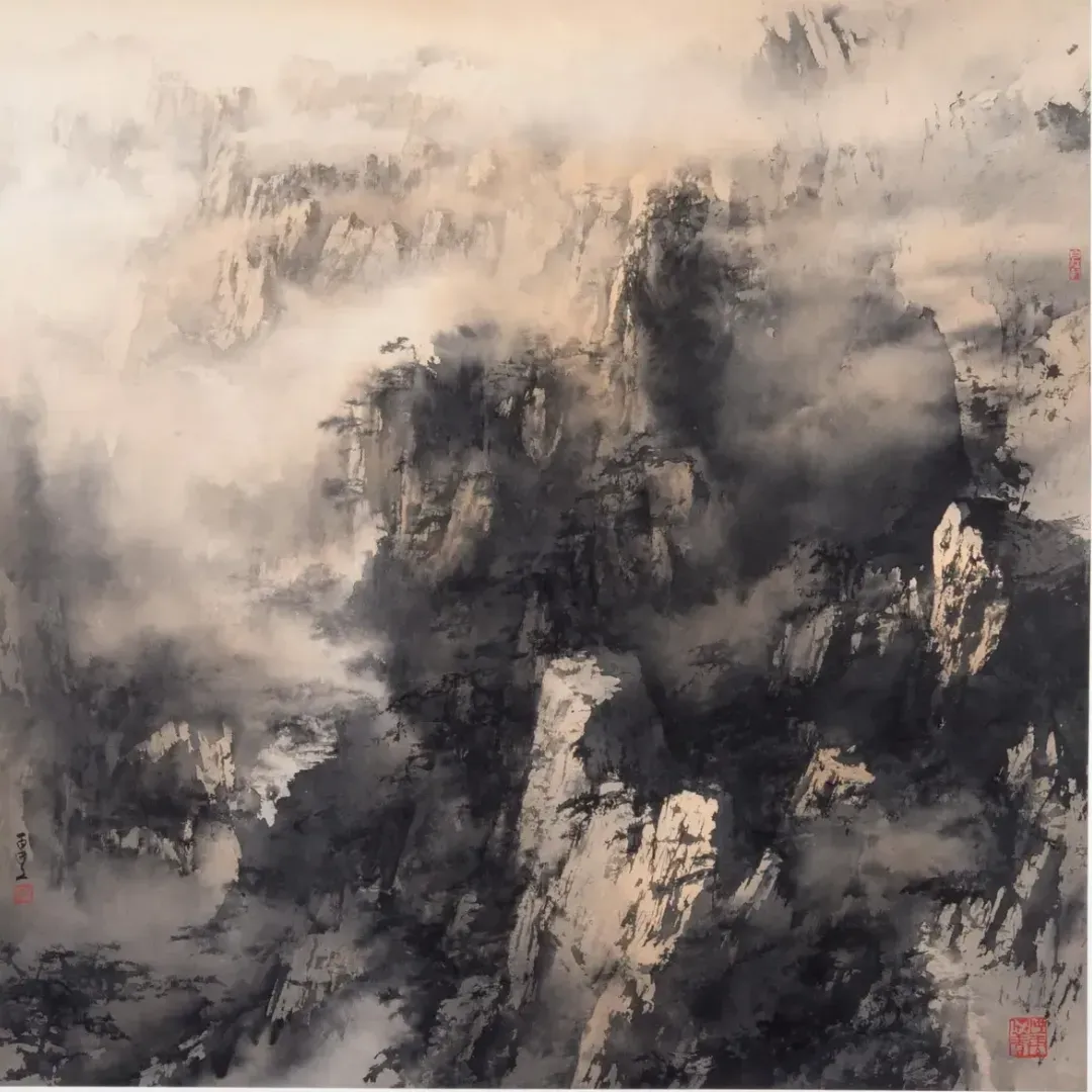 何⽒博取西方繪畫之長和參匯宋元山水理法,創立了彩墨交融,古情新意的「何家山水」。近年來,因一次中國北方太行山的旅行穫得啓發,以寬廣而抒情的筆觸,描繪了晨光透過薄霧投射在山上的壯麗景象;那裡令人窒息的高山與南方的田園風光形成鮮明對比。他對懸崖峭壁、若隱若現的雲層和遠山的渲染,呈現出一場視覺盛宴;對何⽒來說,日出象徵著新生和希望,把嶺南畫派中對光及透視之運用提昇極致。
